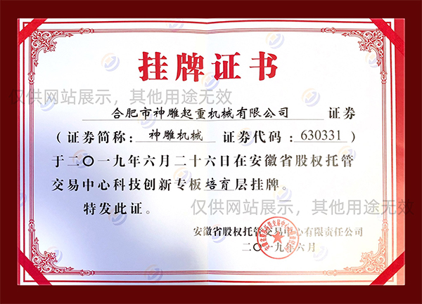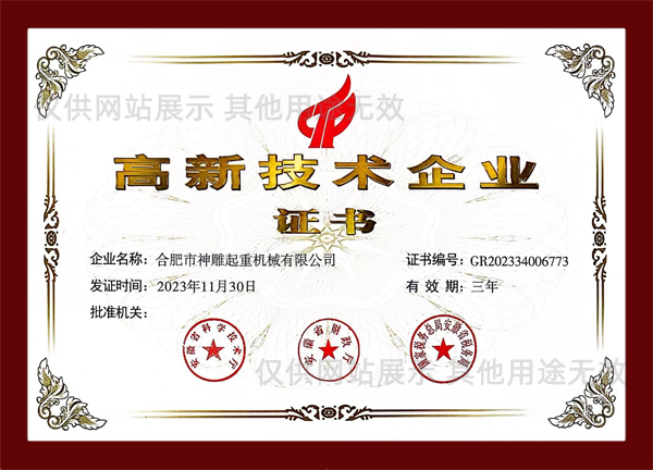 合肥神雕起重是高新技術(shù)企業(yè),是安徽省科創(chuàng)板掛牌企業(yè)(證券代碼:630331),同時(shí)榮獲安徽市場(chǎng)質(zhì)量、誠(chéng)信五星級(jí)企業(yè)、合肥經(jīng)濟(jì)圈示范企業(yè)、合肥市創(chuàng)新型企業(yè)、安徽省市場(chǎng)質(zhì)量放心產(chǎn)品等榮譽(yù)稱(chēng)號(hào)